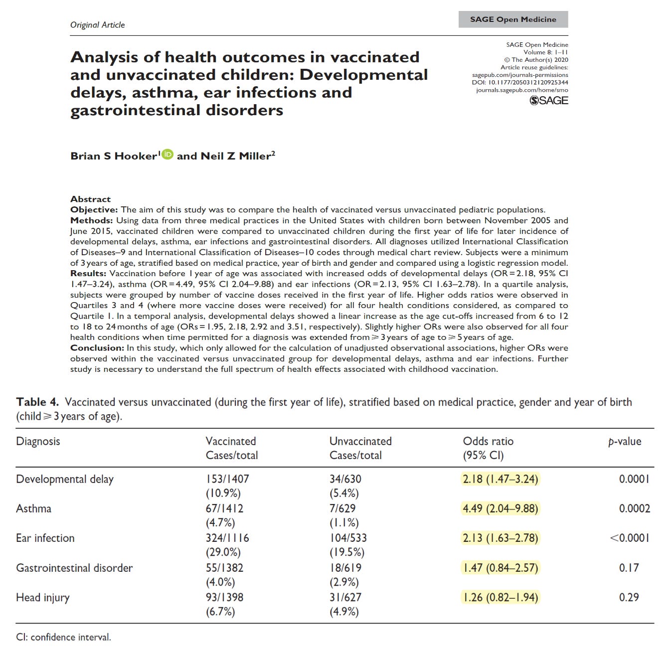 Hooker and Miller examined data from three medical practices in the United States with children born between November 2005 and June 2015. Vaccinated children were compared to unvaccinated children during the first year of life for later incidence of developmental delays, asthma, ear infections and gastrointestinal disorders. Subjects were a minimum of 3 years of age, stratified based on medical practice, year of birth and gender and compared using a logistic regression model. Vaccination before 1 year of age was associated with increased odds of developmental delays (OR = 2.18, 95% CI 1.47–3.24), asthma (OR = 4.49, 95% CI 2.04–9.88) and ear infections (OR = 2.13, 95% CI 1.63–2.78). A quartile analysis of the number of shots was performed to examine dose-response relationships. Higher odds ratios were observed in Quartiles 3 and 4 (where more vaccine doses were received) for all four health conditions considered, as compared to Quartile 1.