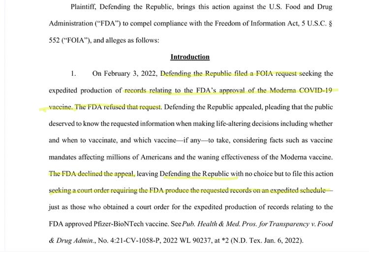 Natalie Winters of The National Pulse reports that a non-profit from Texas called Defending the Republic is suing the FDA after it denied their request for the data that Moderna submitted to the FDA regarding their Covid-19 vaccine and clinical trials.