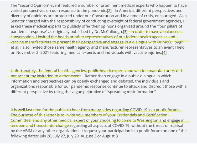 The Daily Clout reports that Dr. Peter McCullough, the most widely published expert in his field of cardiology has been sent a letter by the American Board of Internal Medicine informing him that they will be convening to decide “whether to recommend any disciplinary sanctions” against Dr. McCullough due to his publicly stated opinions. In response, Senator Ron Johnson wrote a letter to the American Board of Internal Medicine saying that he was aware of the warning to Dr. McCullough, and he formally invited them to partake in a public discussion regarding Covid vaccines and Covid protocols. As the Senator wrote, “It is well last(sic) time for the public to hear from many sides regarding COVID-19 in a public forum.”