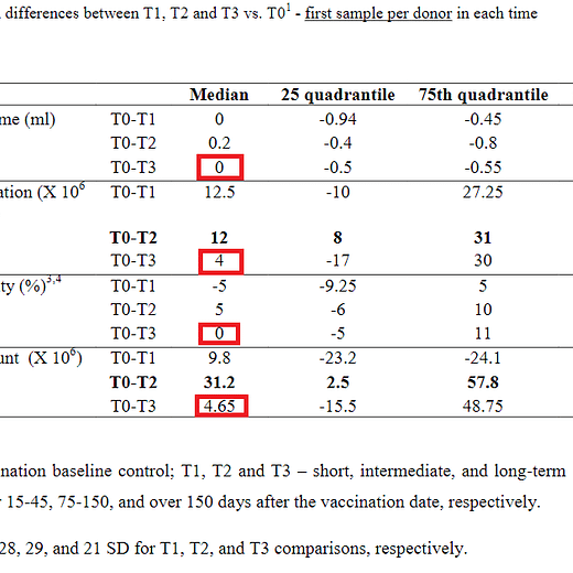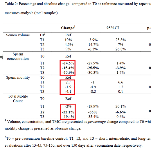 post day 150, sperm concentration was -15.9% vs baseline, lower even than in the 75-120 day period. average time post vaxx for T3 collection was 174 +/- 26.8 days so we’re talking about 6 months post vaxx with NO recovery in sperm concentration.