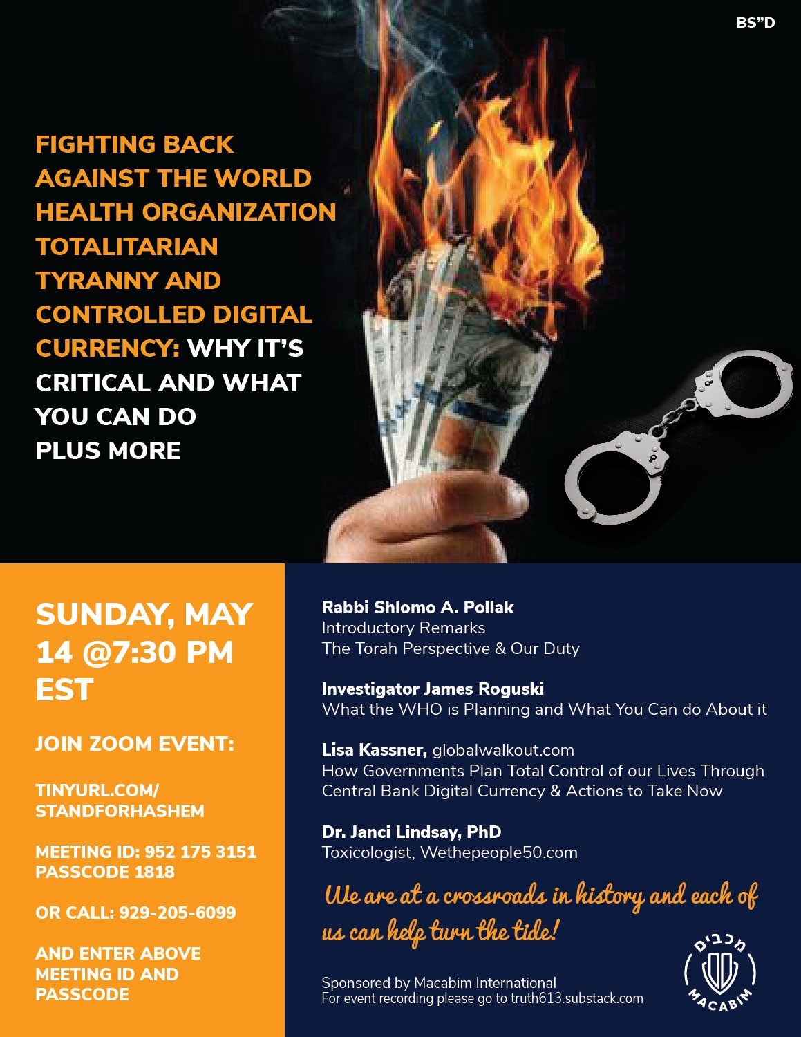 Please join our live zoom event this Sunday evening May 14, at 7:30 PM (Eastern Daylight Time), to learn what you can do to fight the World Health Organization’s tyrannical plans for a totalitarian One-World government.