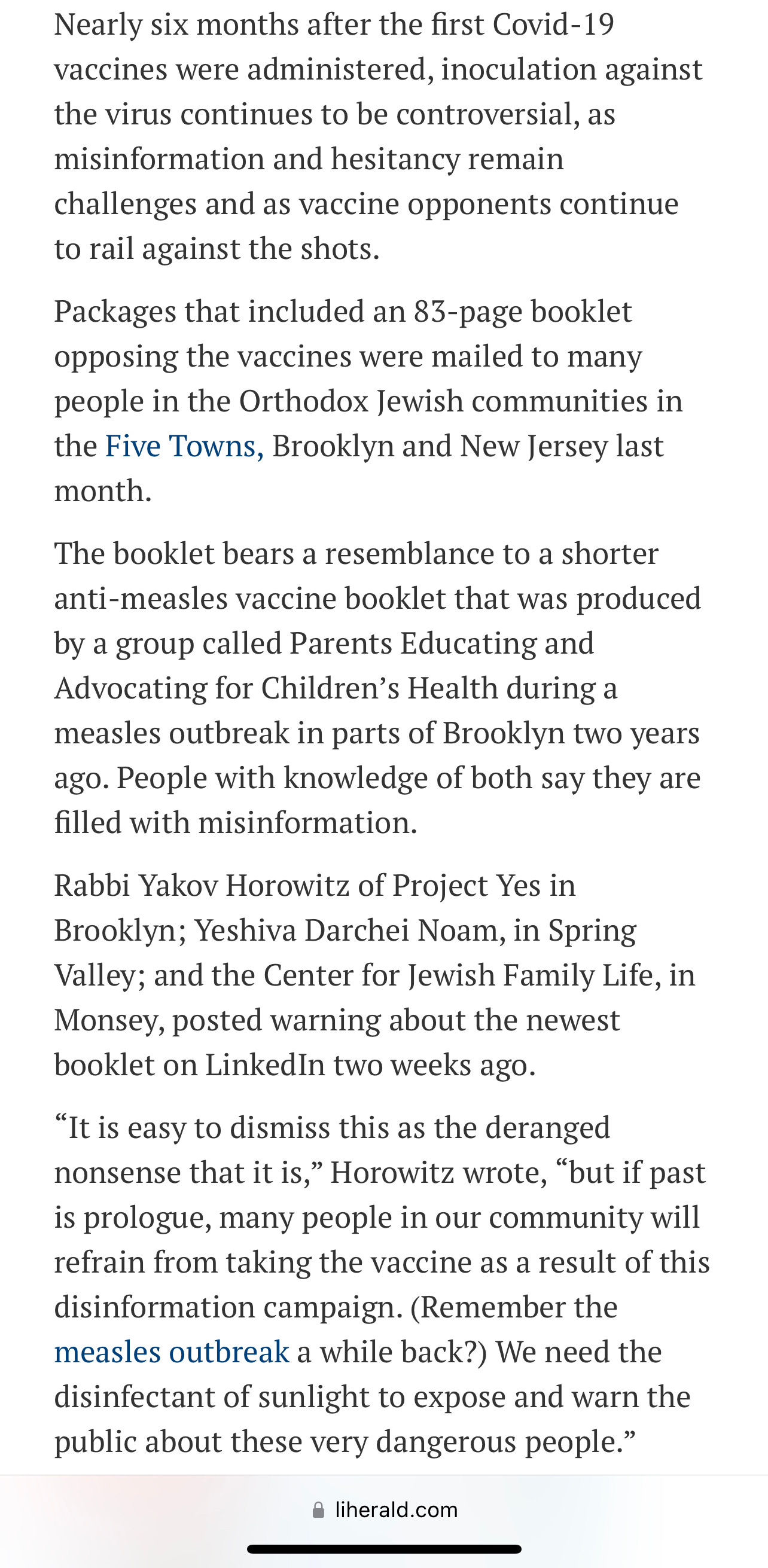 For another fascinating look at the propaganda of 2021, here is an additional article that came out in response to our mailings - in the Long Island Herald. This piece makes a slight attempt to be more balanced. It actually has a picture of the table of contents of my book, Look Before You Leap, which someone spent his savings to send to every community he could, in an effort to save them.