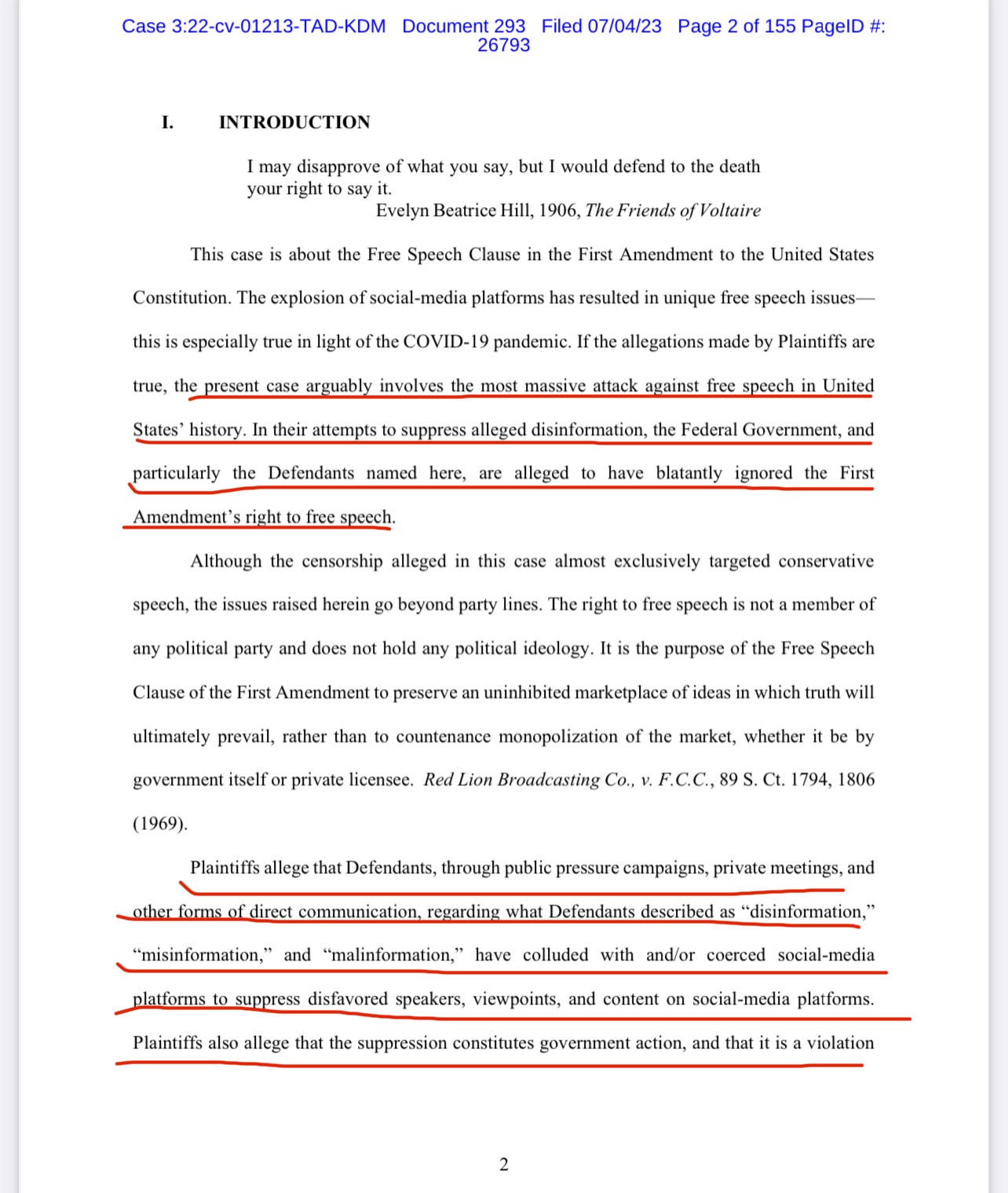 The memorandum is 155 pages long. It goes into great detail of the numerous shocking violations of free speech which the government engaged in.