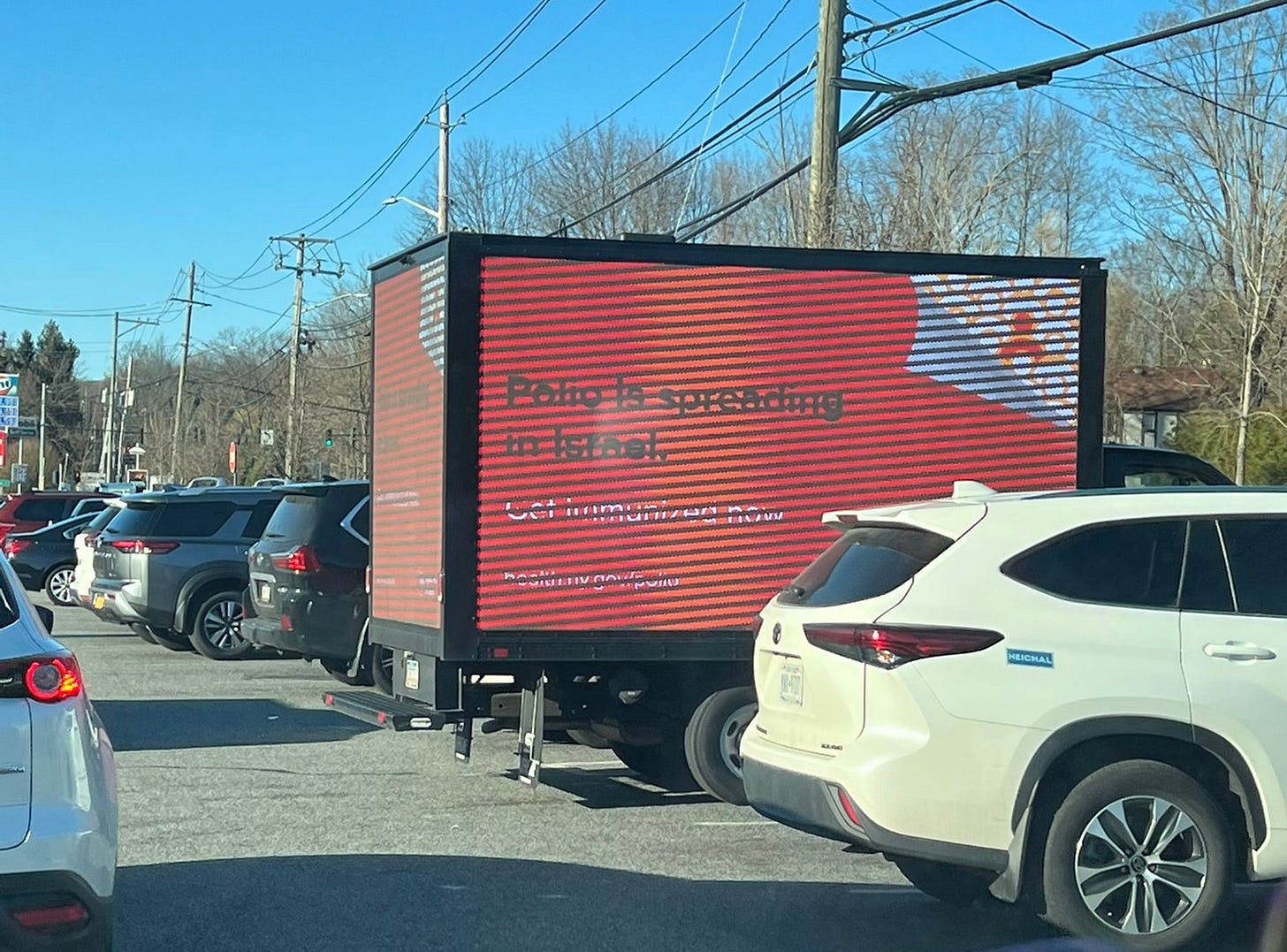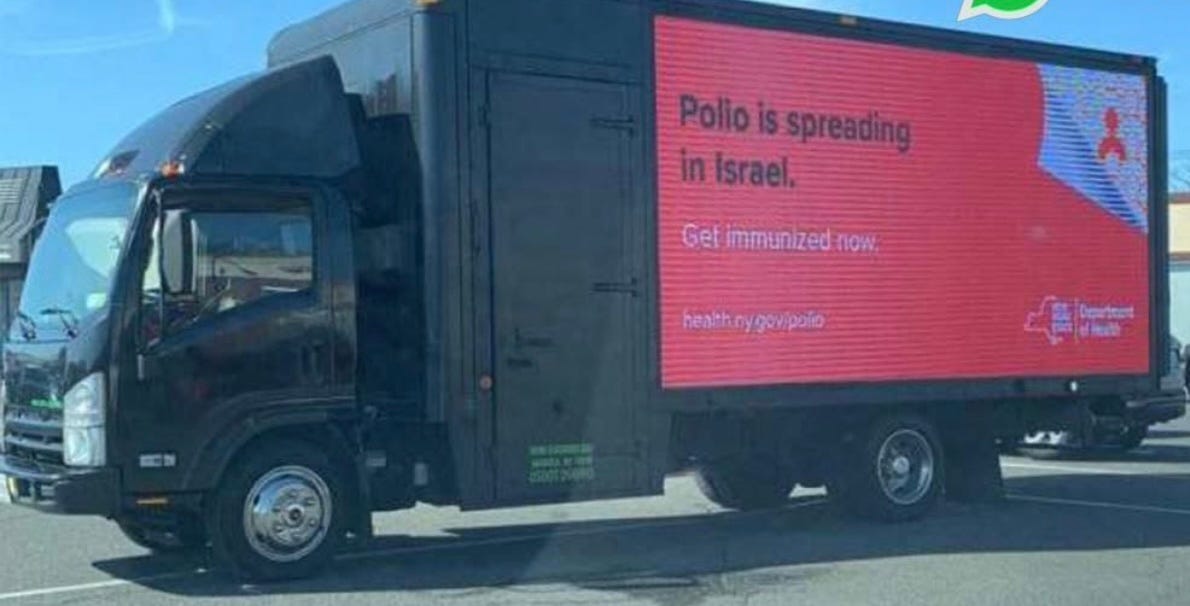 This ad truck was stationed in the parking lot of a kosher supermarket in Rockland County this week. (“Polio is spreading in Israel. Get immunized now.”)