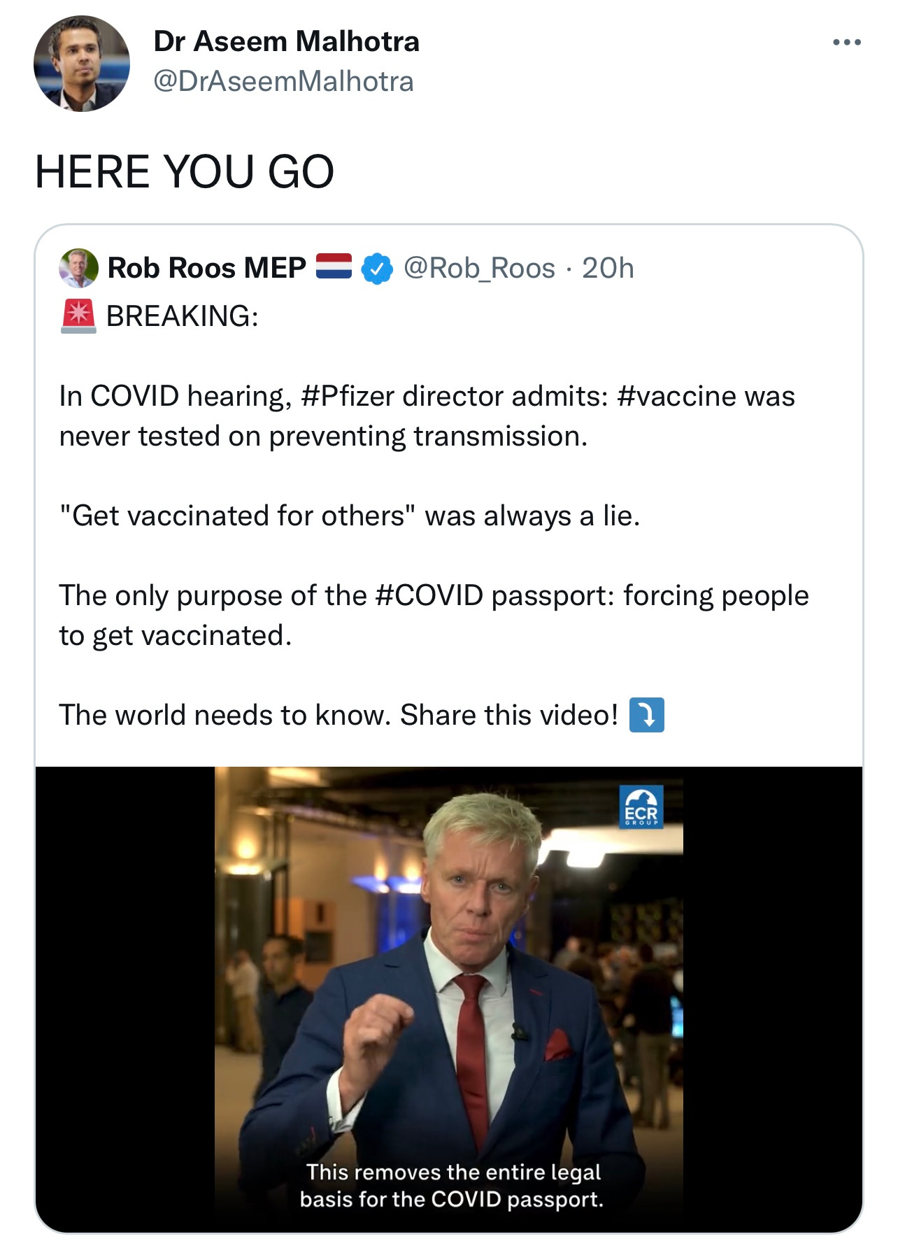 In a covid hearing in the European Parliament, MEP Robert Roos questioned Janine Small, Pfizer President of International Developed Markets, “Was the Pfizer covid vaccine tested on stopping the transmission of the virus before it entered the market?”