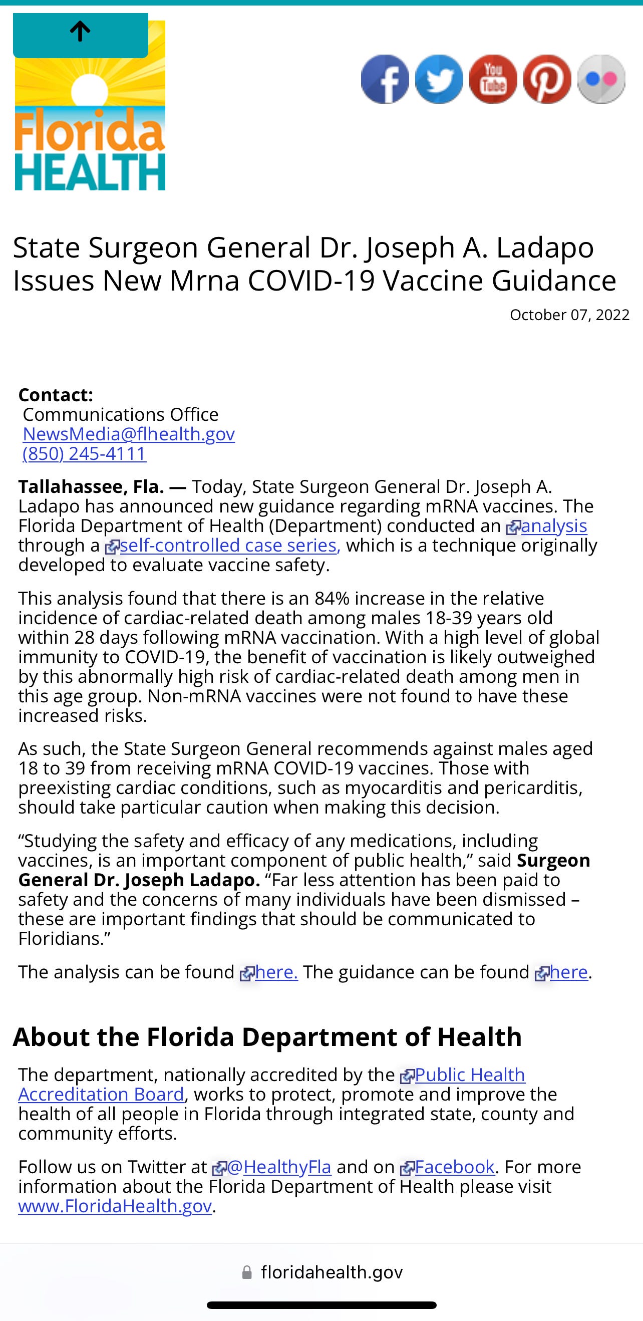 “Florida’s Surgeon General Joseph Ladapo, MD, Ph.D. yesterday issued a concerning tweet declaring the release of a state-sponsored analysis of the COVID-19 mRNA vaccines he believes the public should be aware exists. In this analysis, the state claims that the COVID-19 mRNA vaccines increase the risk of cardiac-related death among men aged 18 to 39 by 84%, and in a message defiant to the federal government, declared, “FL will not be silent on the truth.”