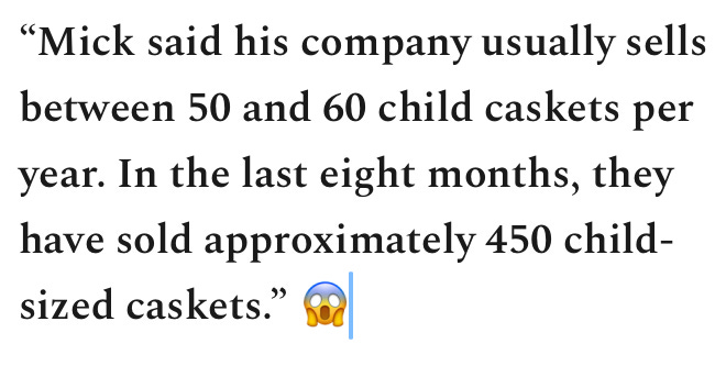 Mick said his company usually sells between 50 and 60 child caskets per year. In the last eight months, they have sold approximately 450 child-sized caskets.