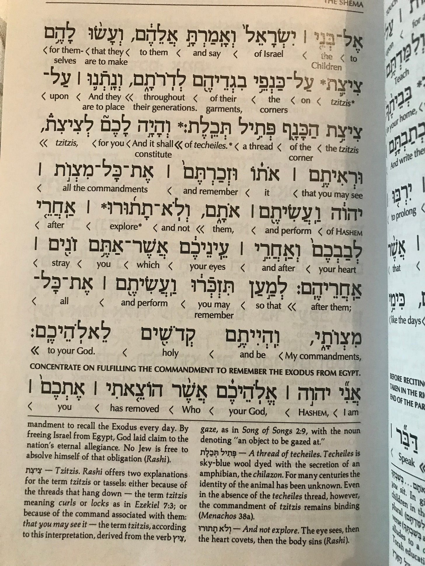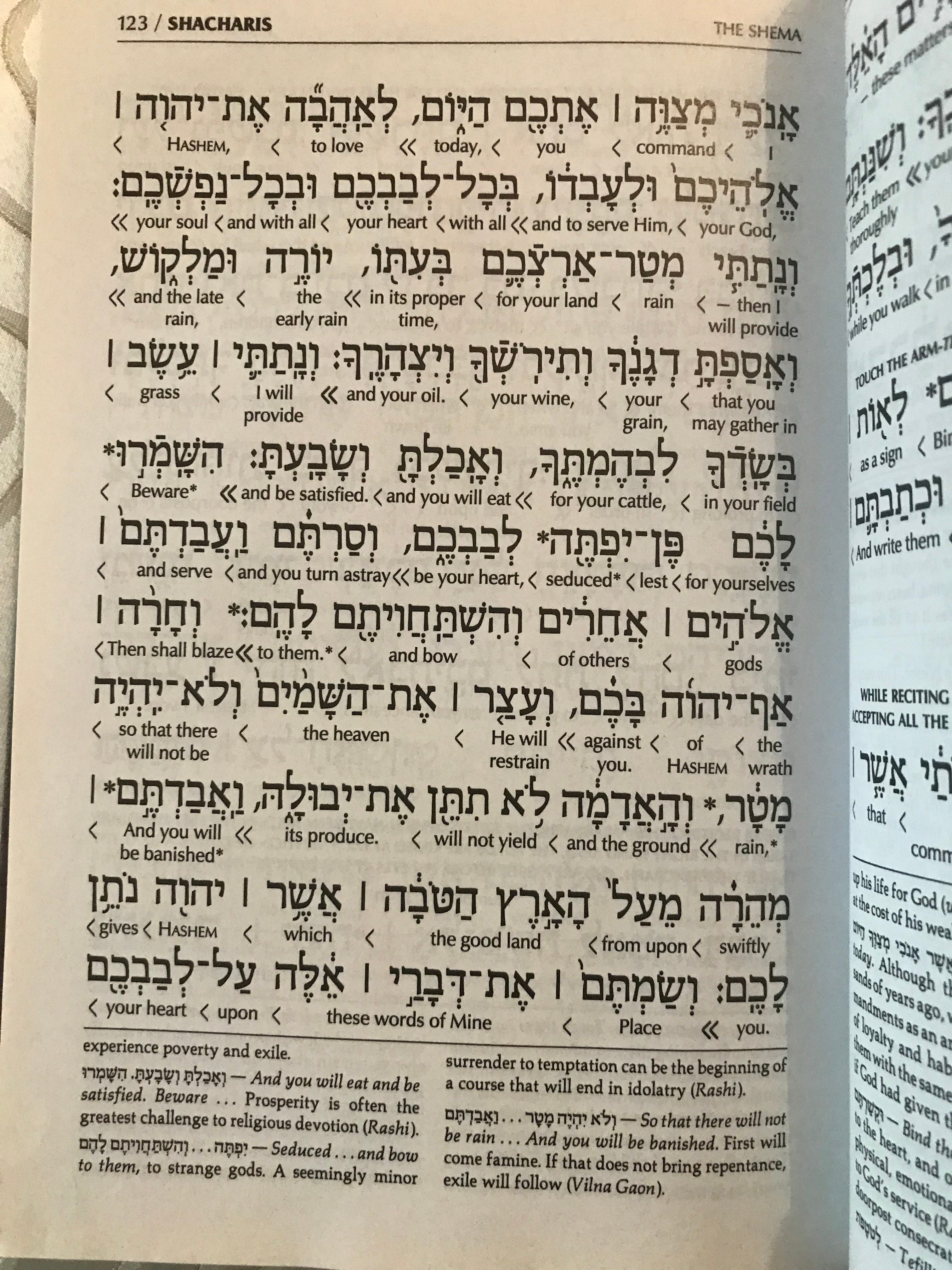 Here are the full three paragraphs of the Shema, photographed from the Artscroll Siddur (prayerbook.) Please note that Hebrew is read right to left, so the translation under the Hebrew words is written the same way, with arrows added to direct your eye. (You can purchase a transliterated Siddur, by the way, so that you can pray in Hebrew words, which are spelled out in English. Or, you can get one with regular English translations (on the opposite page), so you can read the translation straight through easily.)