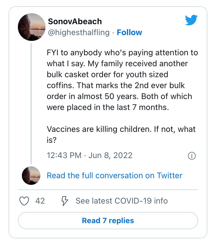 "I think one of them was from Mississippi and the other [funeral director] was from Pennsylvania. And the lady had said to me she sent me a message. She said, 'What you said was so interesting. I had to follow,' so I got a direct message from her where she was saying that they've also seen an uptick in young people dying in her funeral home. And she went on to tell me about, you know, a couple of instances in the last week."