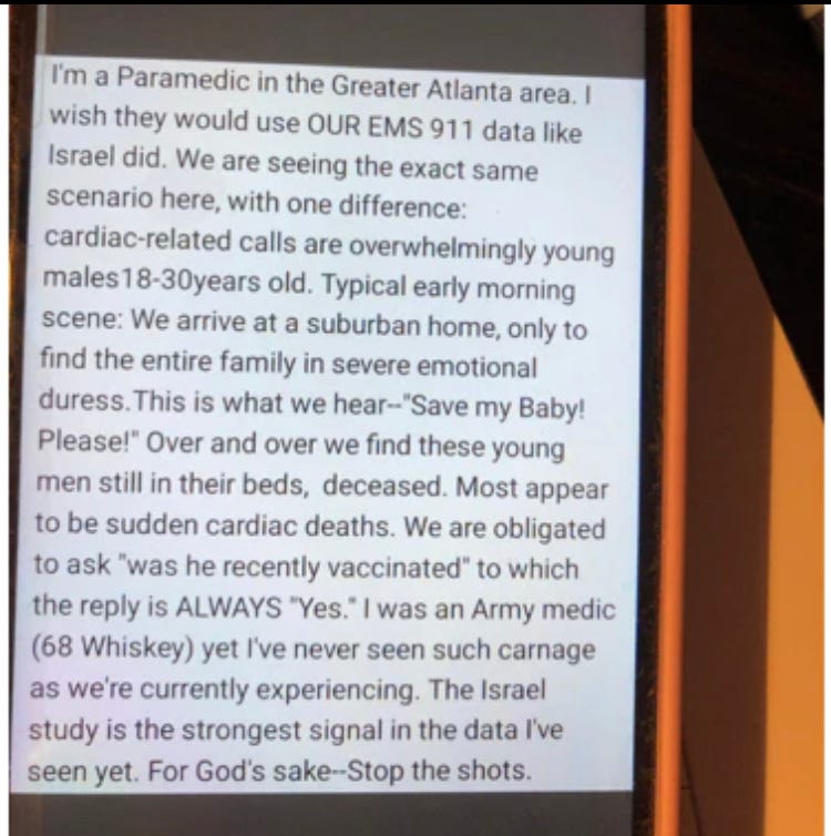 In Part I of my “Reports from the Front Lines of the Vaccine Catastrophe,” I relayed first hand information from senior nurses who work in emergency rooms, hospital wards and intensive care units regarding unprecedented amounts of young people presenting with cancers, strokes, and heart attacks. For a brilliant, succinct layperson’s explanation as to the pathophysiology of how and why these medical events are occurring, please read this substack post by my friend and colleague Dr. Kevin Stillwagon (he is also an airline pilot).