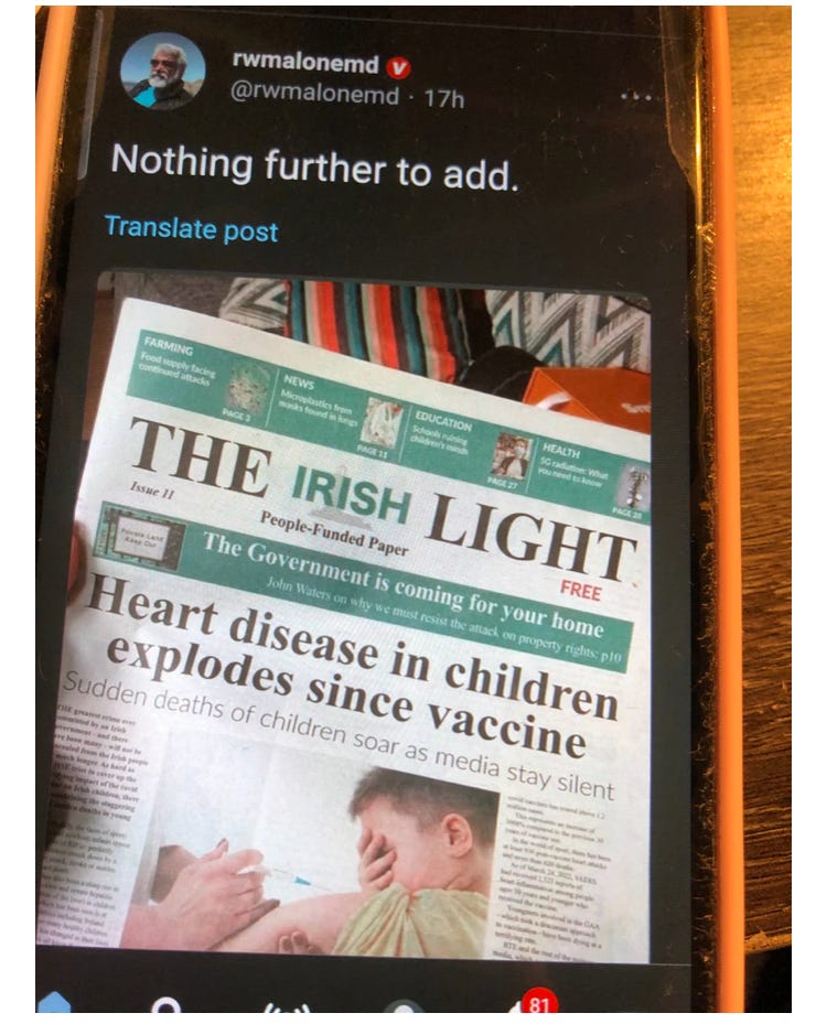 Now let’s switch to more positive stuff (sort of?). This bombshell news article from a major newspaper was posted by Robert Malone. I find this headline unprecedented and evidences a clear “crack" in the dam of propaganda and censorship… A trickle.. will hopefully become a river: