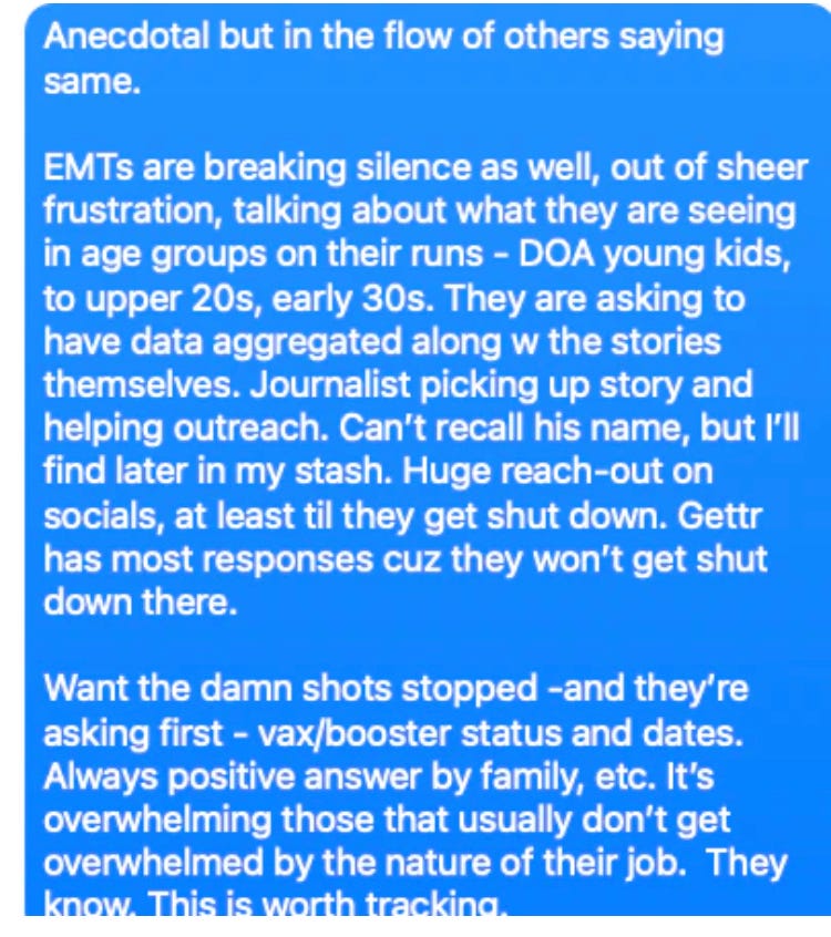 Apparently, there is a reporter from Canada who is actively seeking reports from emergency medical technicians, funeral home directors, embalmers, and nurses on Twitter and other social media. He appears outraged that the “main stream media” has been ignoring these data. What is this, the first mainstream journalist to wake up and have courage to address the global democide? Here is one of the direct messages to him from a very concerned paramedic: