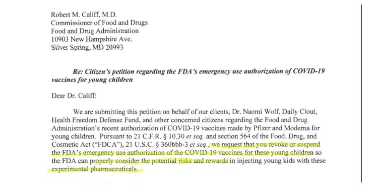 “A Shot Across the Bow”: Dr. Naomi Wolf of Daily Clout and the Health Freedom Defense Fund fund filed a citizen’s petition with the FDA to request a reversal or suspension of their EUA for Covid-19 vaccines for children. They requested attention for the more than 130,000 comments regarding the EUA that were submitted by the public. Scott Street and John Howard are among the attorneys who successfully put a stop to the forced masking on airplanes, to the huge relief and gratitude of millions of people. They’re now representing Daily Clout and the HFDF in the efforts to end the Covid vaccines for children.